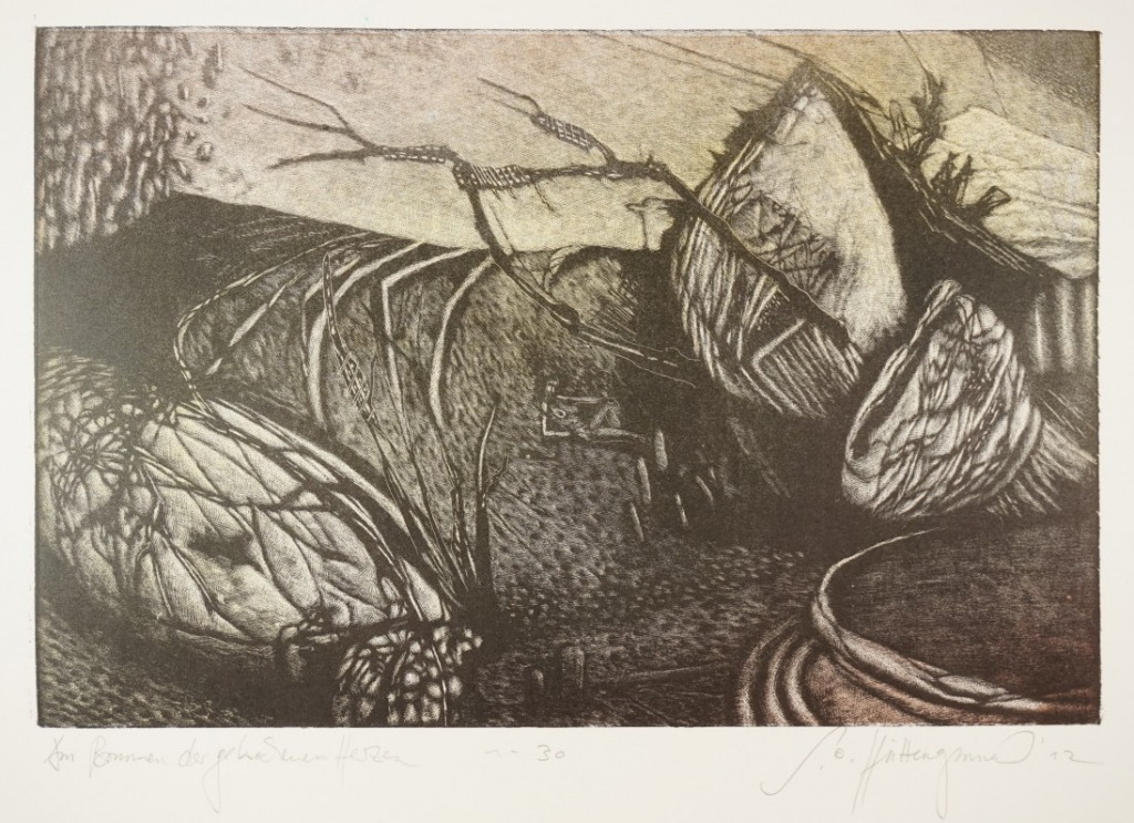 Galerie Bl. 6 Am Brunnen der gebrochenen HerzenMappe: 12.HolzbildhauerpleinairFarbholzriss, 18,5x28,0 40,0x30,0 cm, 1/30 2012Otto-Hüttengrund Siegfried