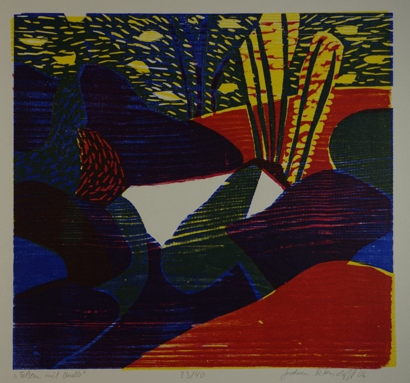 Galerie Bl.8 Felsen mit QuelleMappe: Nitzsche G. "Mondmilch"Farbholzschnitt, 24,3x26,0 30,5x32,5 cm, 23/40 2006Petersdorff Gudrun