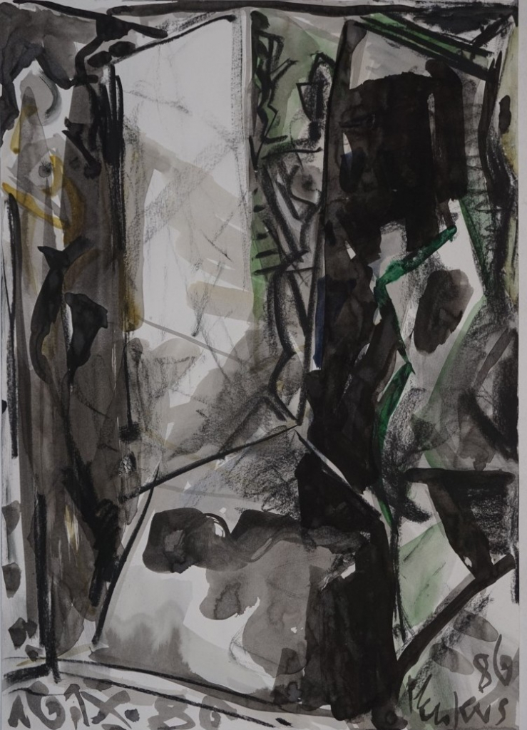 Galerie SpiegelungenSchwarze u. farbige Tusche/Sibirische Kohle, 59,0x42,0 cm, 20.IX.1986Plenkers Stefan