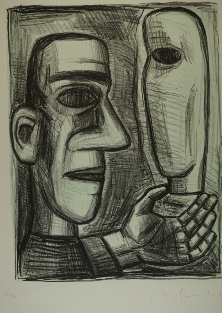 Galerie Bl.4 o.T. Mann Skulptur tragendMappe: Berliner Grafikpresse Quevedo N. "Das Leben ist ein Traum"Lithografie, 37,0x28,5 53,0x40,0 cm, 66/100 1989Quevedo Nuria