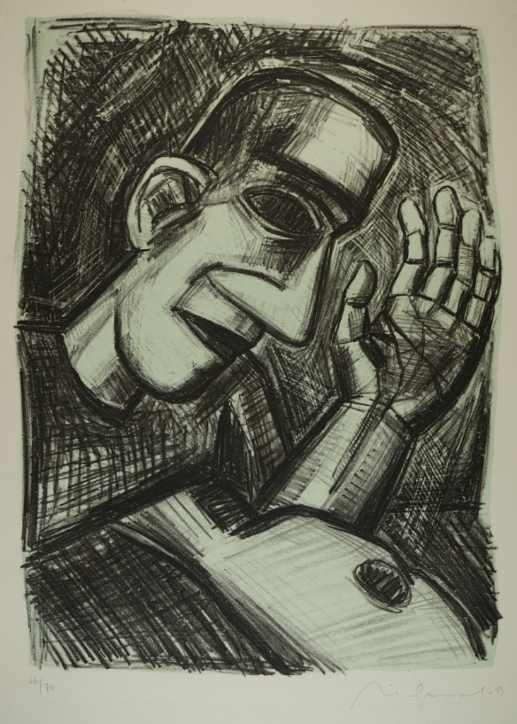 Galerie Bl.5 o.T. Mann aufstützendMappe: Berliner Grafikpresse Quevedo N. "Das Leben ist ein Traum"Lithografie, 39,5x29,5 53,0x40,0 cm, 66/100 1989Quevedo Nuria