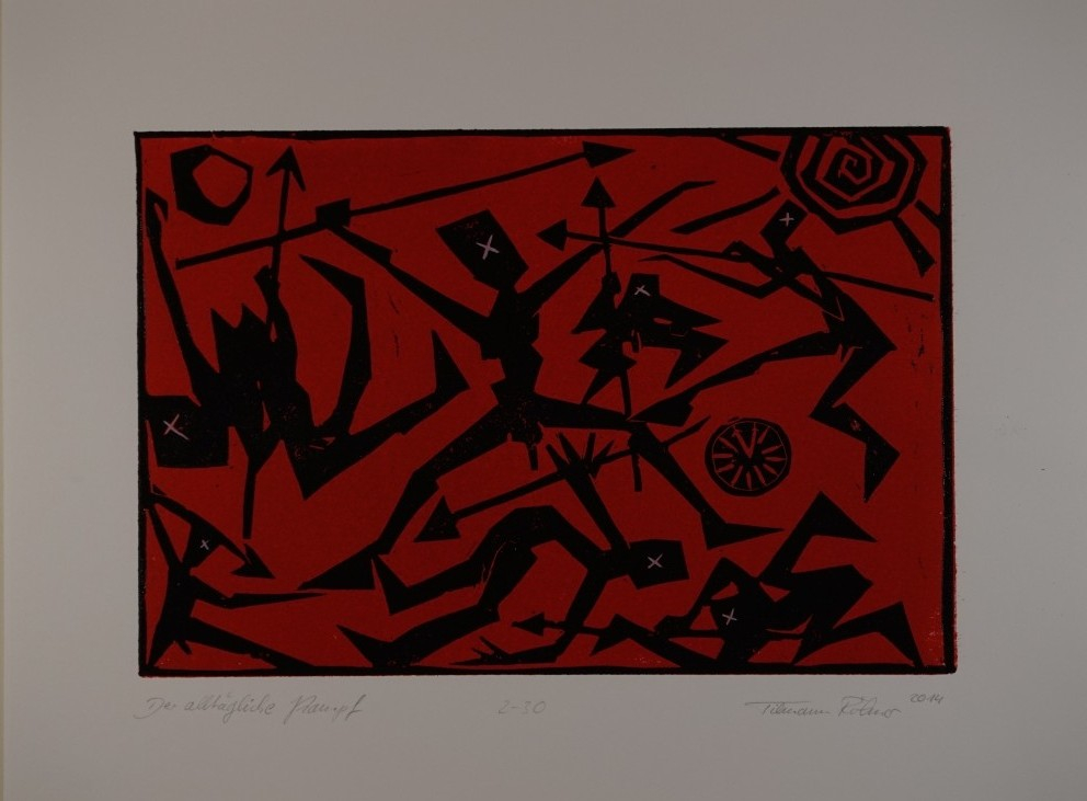 Galerie Bl. 8 Der alltägliche KampfMappe: 14.HolzbildhauerpleinairFarbholzschnitt, 20,3x30,0 30,1x40,1 cm, 2/30 2014Röhner Tilmann