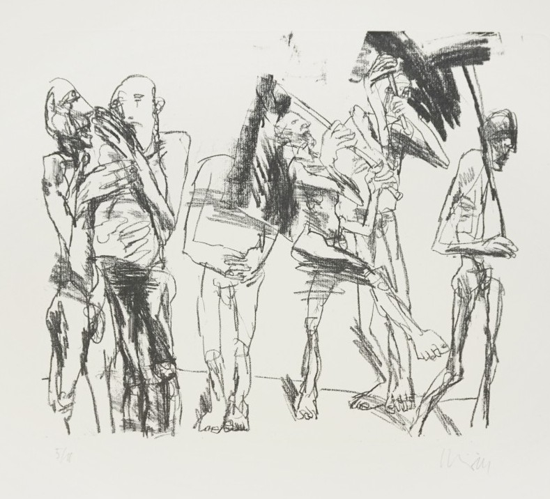 Galerie Wohin-nun ? (Männer mit Fahnen) Bl.ILithografie, 36,5x43,0 54,0x69,5 cm, 5/10 1998Schnürpel Peter