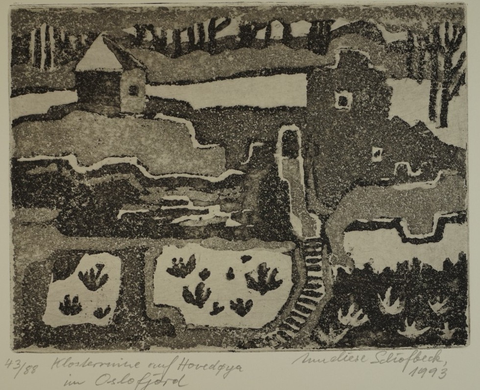 Galerie Bl.16 Klosterruine auf Horedoya im OslofjordMappe: Janus press "Ein Blatt für C.W."Radierung, 16,3x21,5 60,0x54,0 cm, 43/50 1993Schöfbeck Anneliese
