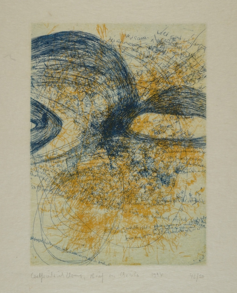 Galerie Bl.2 Brief an Christa (Wolf)Mappe: Janus press "Ein Blatt für C.W."Farbradierung, 17,5x12,7 54,0x40,0 cm, 43/50 1994Claus Carlfriedrich