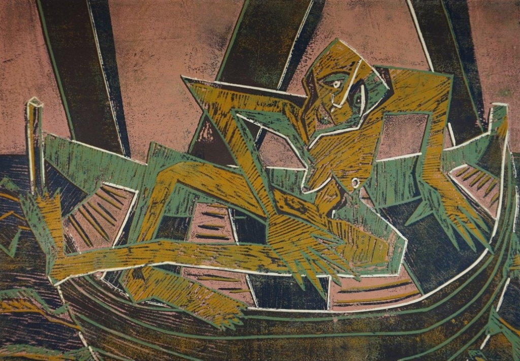 Galerie Bl.3 Überquerung des TotenflussesMappe: Süß K. "Psyche und Amor"Linolschnitt, 70,0X48,5 cm, 6/10 1988Süß Klaus