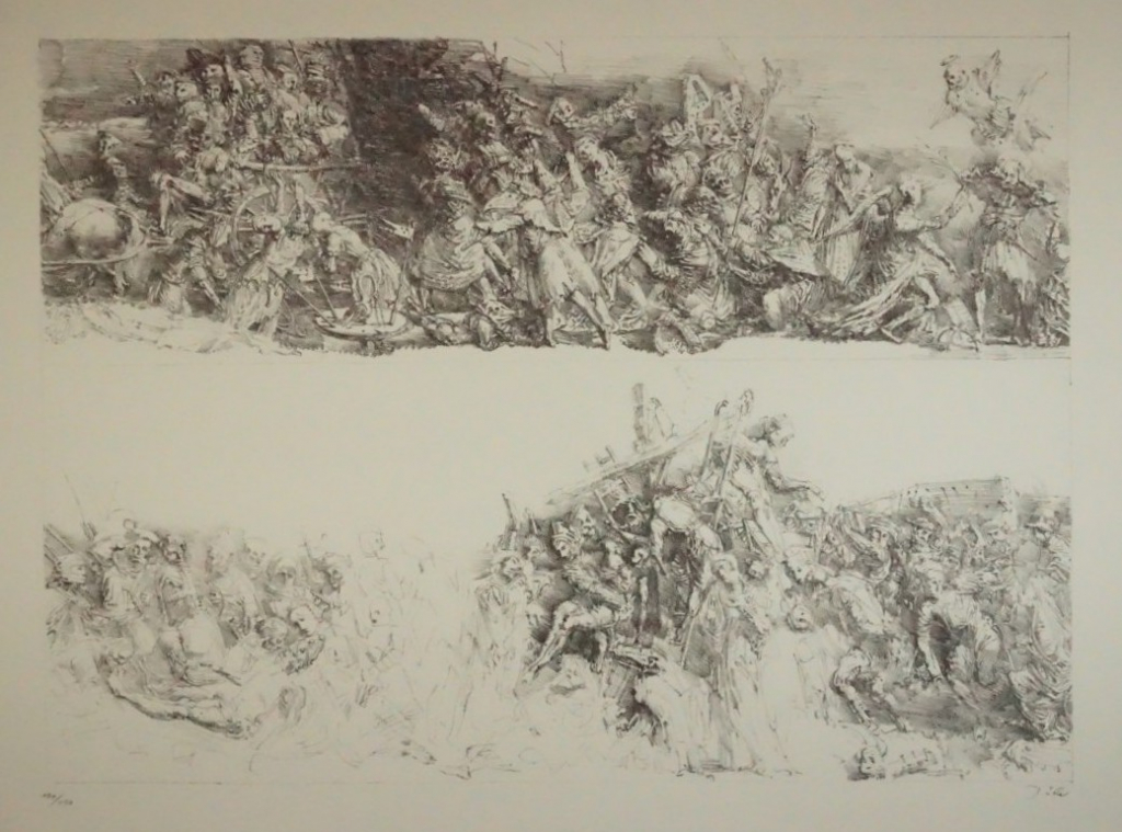 Galerie Bl.2 Zug der Pestkranken, KreuzabnahmeMappe: Reclamverlag Grafikedition XI Tübke W. "Vom schöneren Tod"Lithografie, 28,5x41,5 39,0x52,5 cm, 101/150Tübke Werner