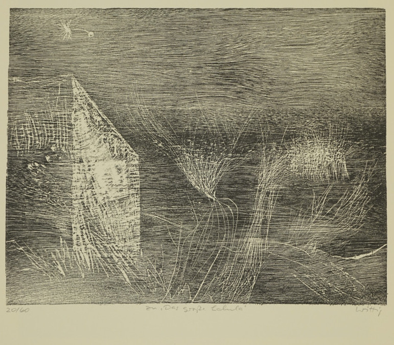 Galerie Zu "Das große Lalula" Bl.5Mappe: Grafik-Presse "eikon" Wittig W. "Tagnachtlampe"Holzriss, 25,5x32,7 44,0x55,0 cm, 20/60 1984Wittig Werner
