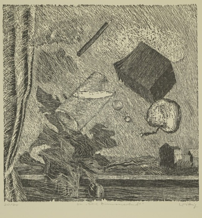 Galerie Zu "Die Zimmerluft" Bl.12Mappe: Grafik-Presse "eikon" Wittig W. "Tagnachtlampe"Holzriss, 30,5x30,5 55,0x44,0 cm, 20/60 1984Wittig Werner