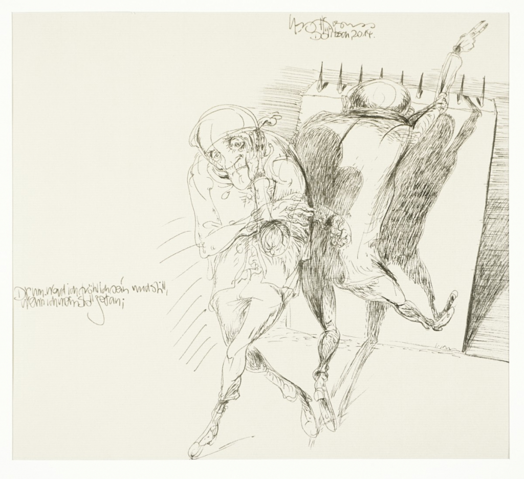 Galerie Drum werd ich fröhlich sein und still, wenn ich mein Soll getragenFeder, 21,5x23,0 cm, 2014Hirsch Karl-Georg