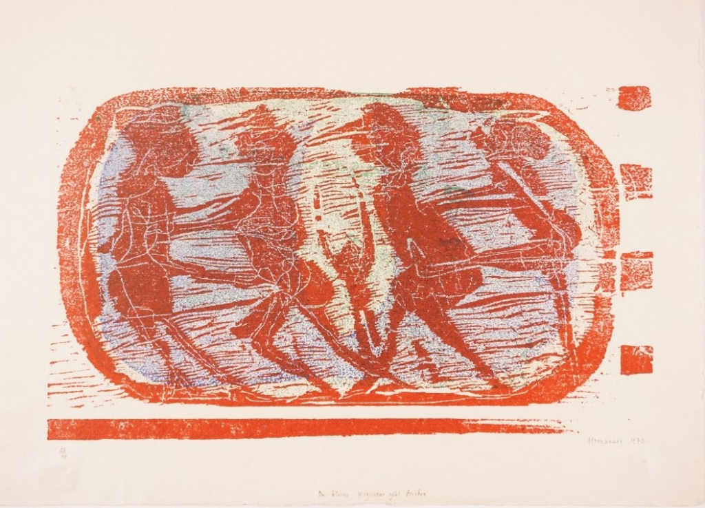Galerie Bl. 1 Der kleine Regisseur gibt ZeichenMappe: Erfurter Ateliergemeinschaft 1970 "Chiffren"Farbholzschnitt, 20,8x35,5 30,8x42,2 cm, 25/50 1970Altenbourg Gerhard