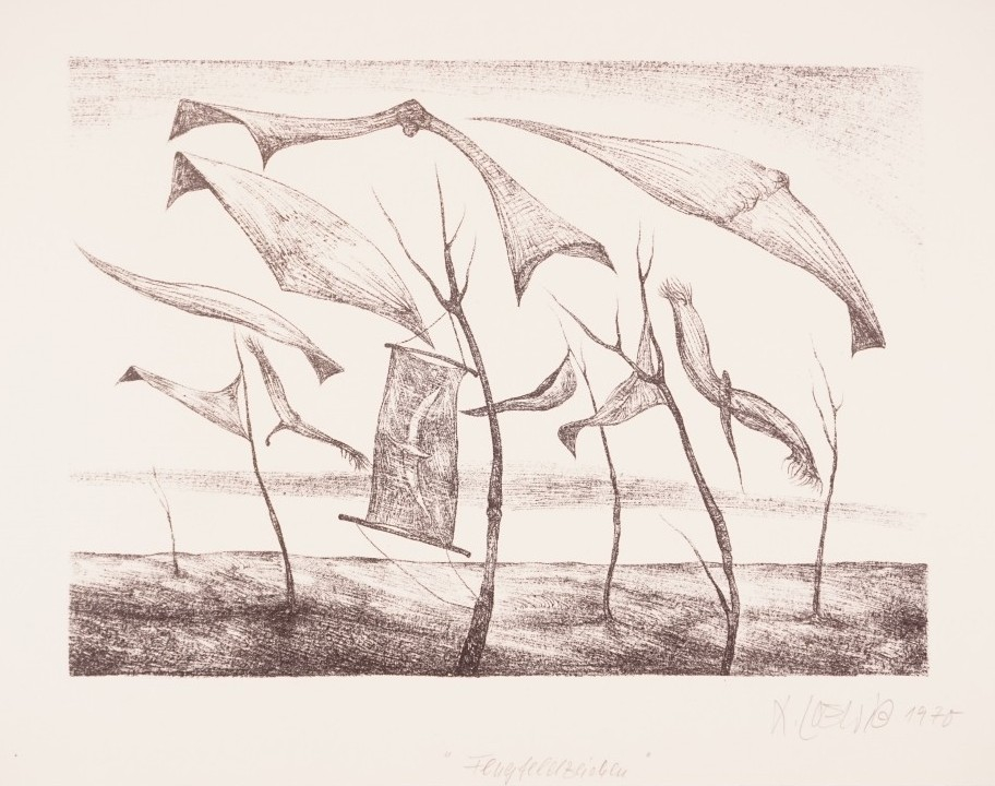 Galerie Bl. 4 FlugfeldzeichenMappe: Erfurter Ateliergemeinschaft 1970 "Chiffren"Lithografie, 22,2x31,2 30,0x42,0 cm, 15/40 1970Loewig Roger