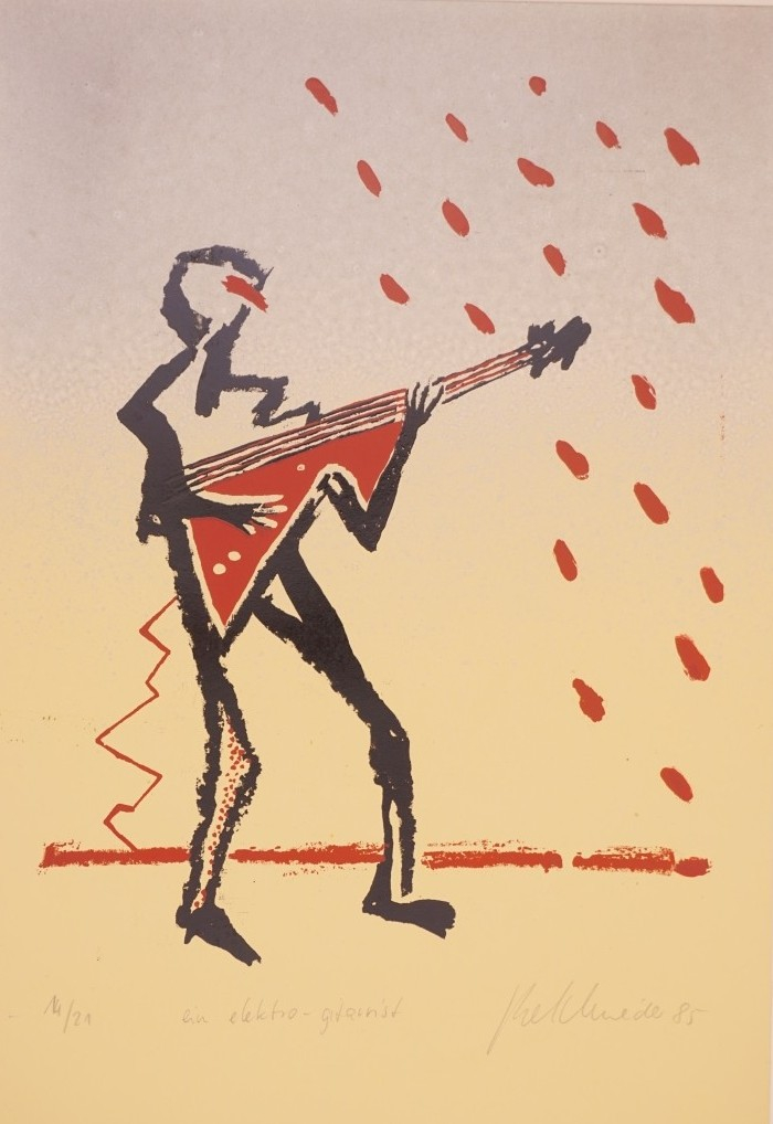 Galerie Ein Elektro-GitarristMappe: A DREI 2/85/7 Farbsiebdruck, 42,3x29,2 cm, 14/21 1985Bretschneider Frank