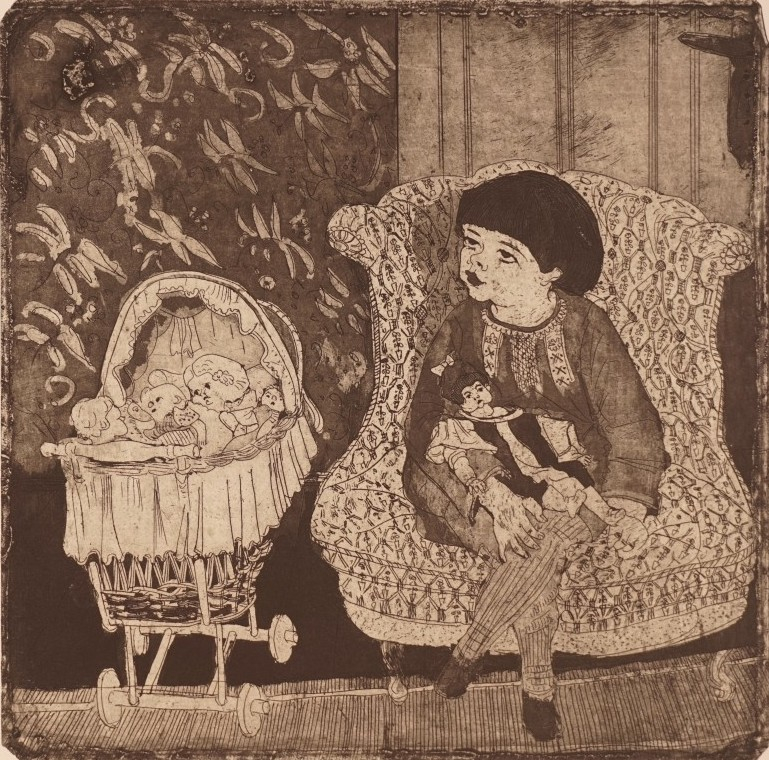 Galerie Mein Töchterchen im StuhlMappe: Grafik-Presse "eikon" "Fastnachtsspuk im Wallgässchen"Radierung, 32,7x32,7 53,5x39,5 cm, 40/50 1988Körnig Hans