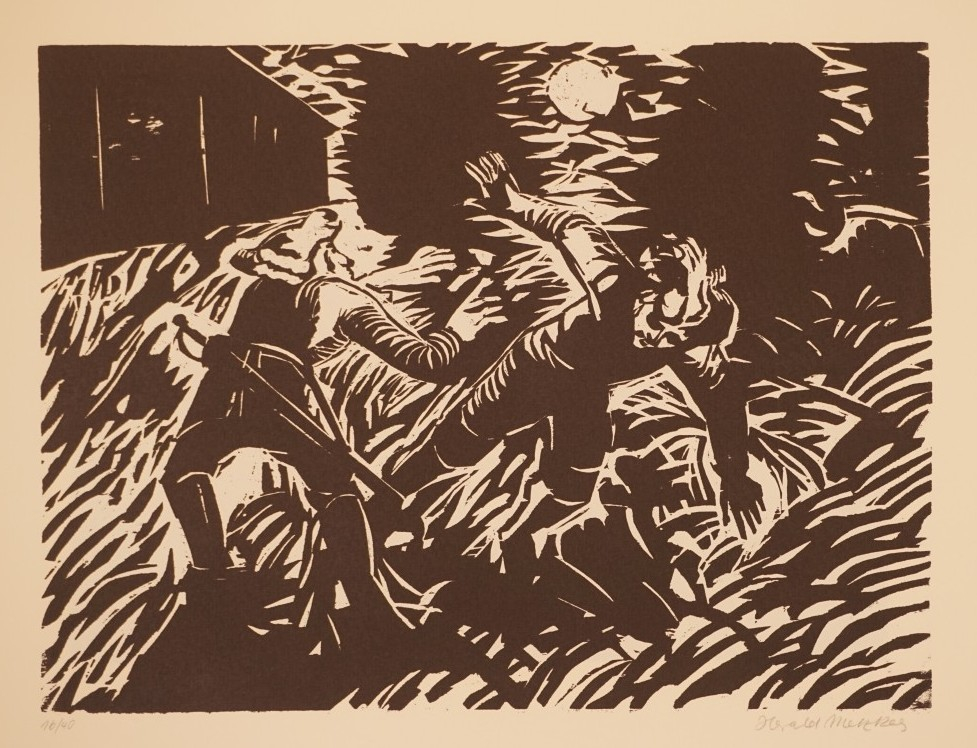 Galerie Bl.3 Da liegt er; eine Kugel trifft nicht besser!Mappe: Metzkes H. "Prinz Friedrich von Homburg" zu H. v. KleistHolzschnitt, 27,5x36,0 38,0x50,5 cm, 16/40Metzkes Harald