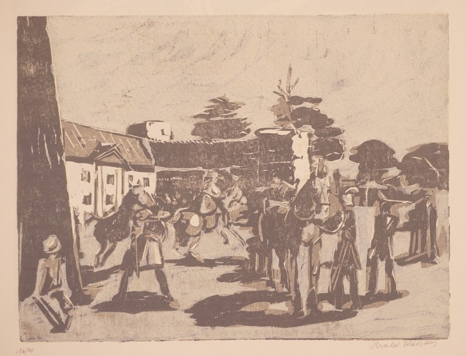 Galerie Bl.14 Damit nach Arnstein ab, und gebt's dem Kottwitz !Mappe: Metzkes H. "Prinz Friedrich von Homburg" zu H. v. KleistHolzschnitt, 27,3x36,2 38,0x50,5 cm, 16/40Metzkes Harald