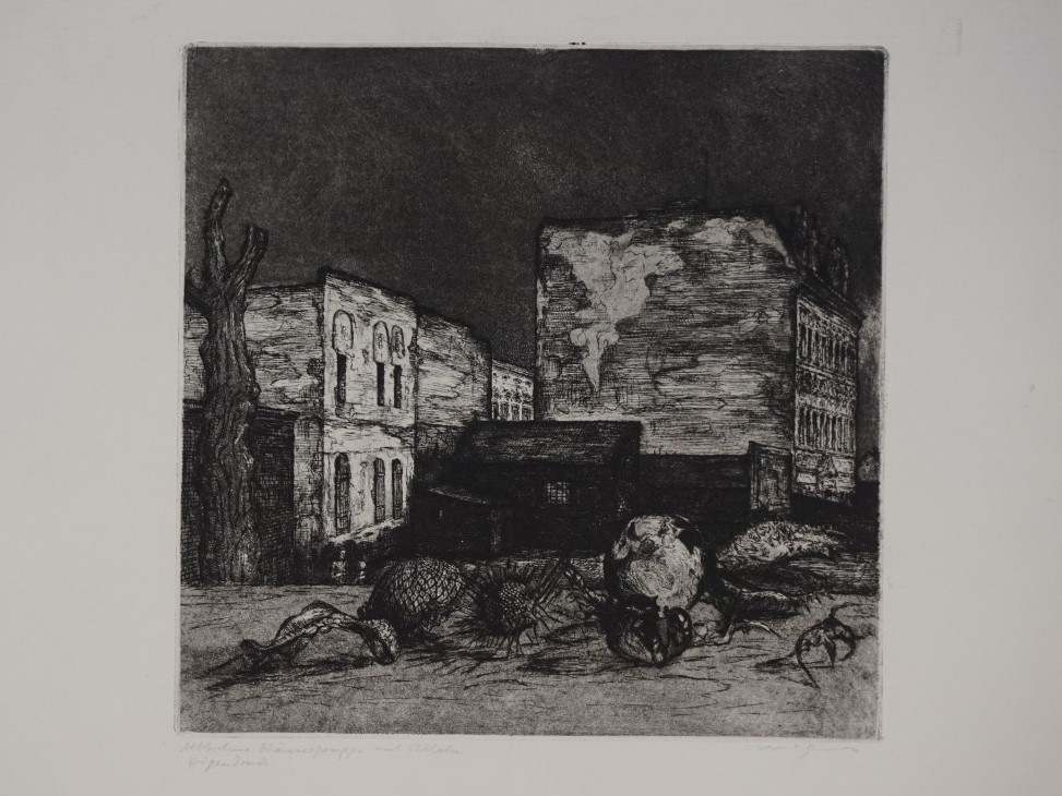 Galerie Altberliner Häusergruppe mit StillebenRadierung, 31,6x32,3 40,0x50,0 cm, EigendruckMagnus Klaus