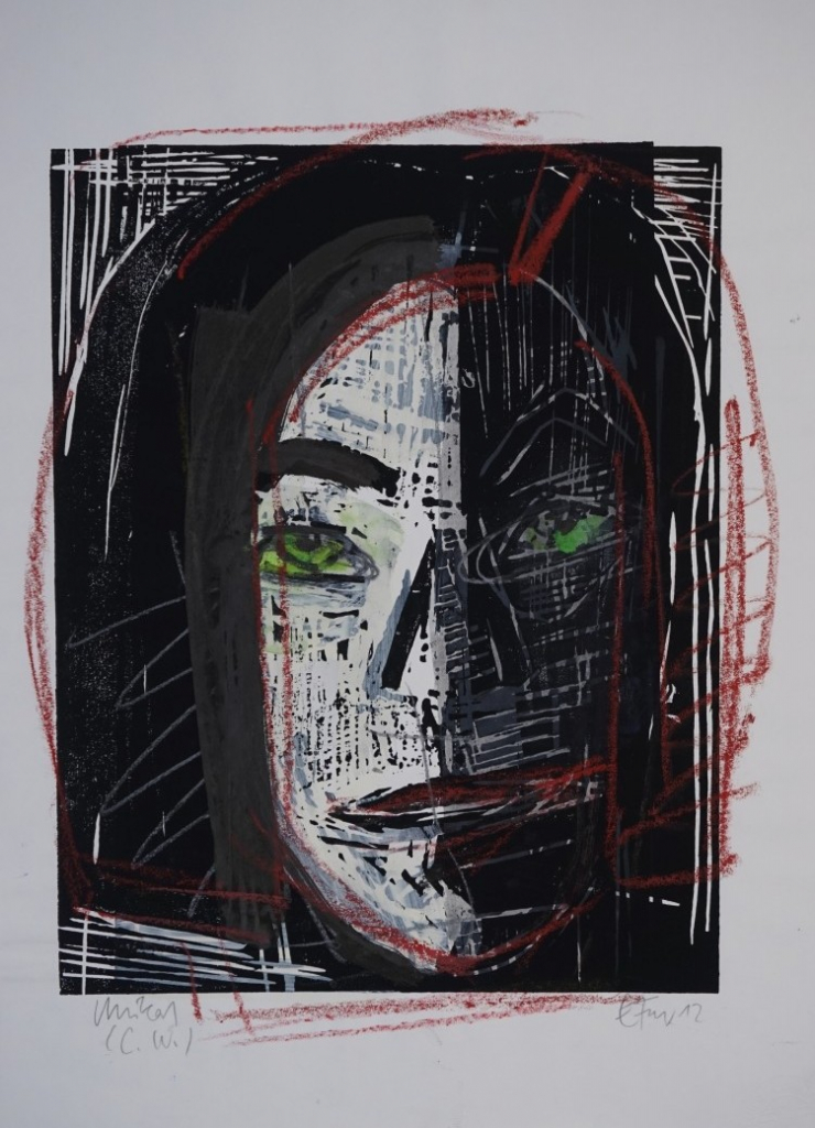 Kreide/Tusche über Holzschnitt