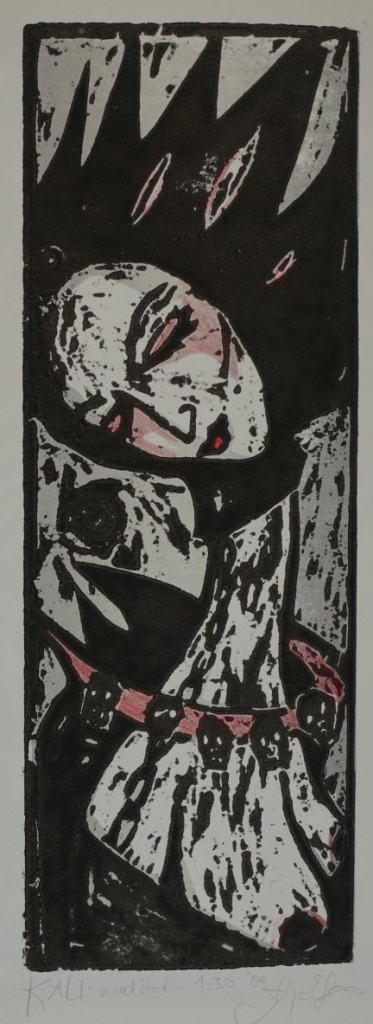 Galerie Bl.2 Kali-meditativMappe: 9.Holzbildhauerpleinaircolorierter Farbholzschnitt, 28,0x9,8 30,0x40,0 cm, 1-30 2009Elze Anja