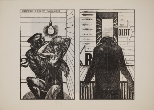 Galerie "Der Tod der Elsa Baskoleit" von Heinrich BöllMappe: 1.Leipziger Grafikmappe zur LiteraturHolzschnitt, 29,1x35,5 34,0x48,0 cm, 1972Hirsch Karl-Georg