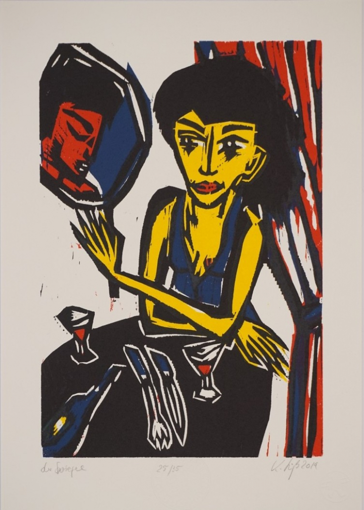 Galerie Im Spiegel o. Penthesilea im CaféMappe: Pirckheimer Edition IFarbholzschnitt, 34,2x23,2 42,5x29,5 cm, 25/35 2019Süß Klaus