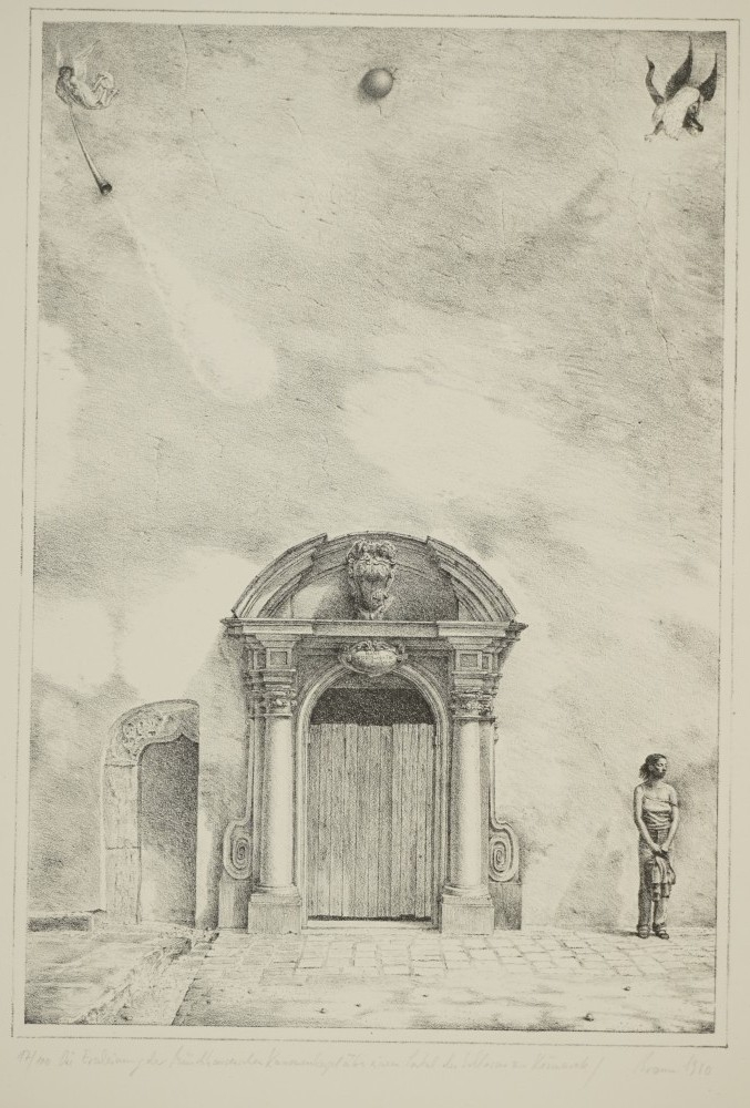 Galerie Die Erscheinung der Münchhausenschen Kanonenkugel über dem Portal des Schlosses KezmarokLithografie, 40,0x27,5 cm, 17/100 1980Braun Jost