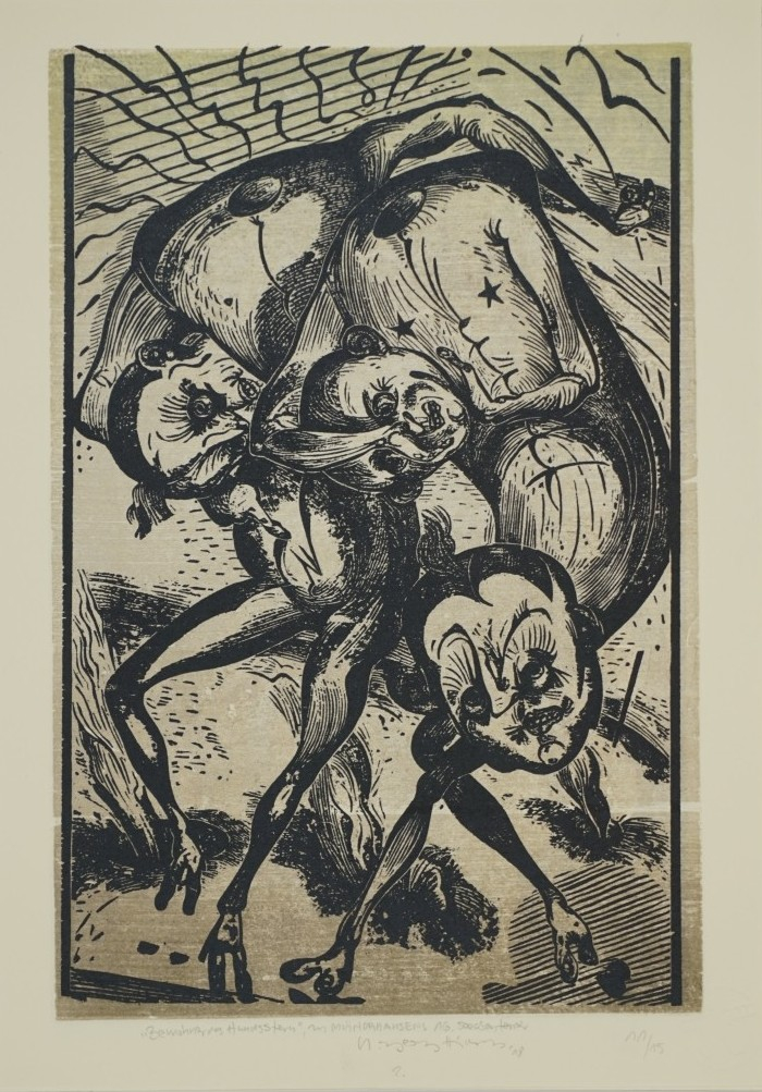 Galerie Bl.2 Bewohner des Hundsstern zu MünchhausenMappe: Hirsch K.-G. Edition Zwi 2019 "zugefügt"Farbholzschnitt, 30,3x20,2 34,0x24,0 cm, 11/15 2018Hirsch Karl-Georg